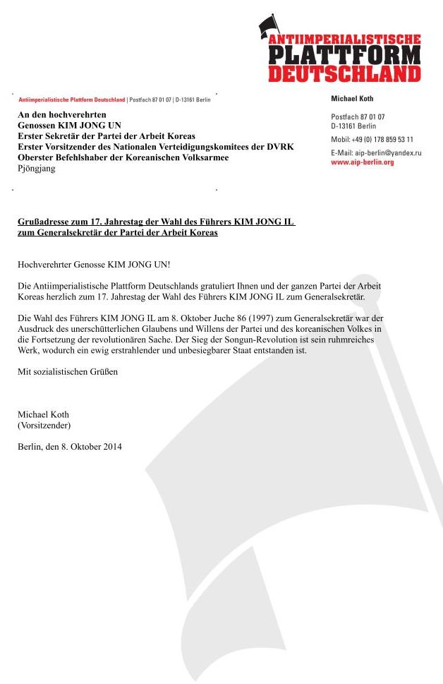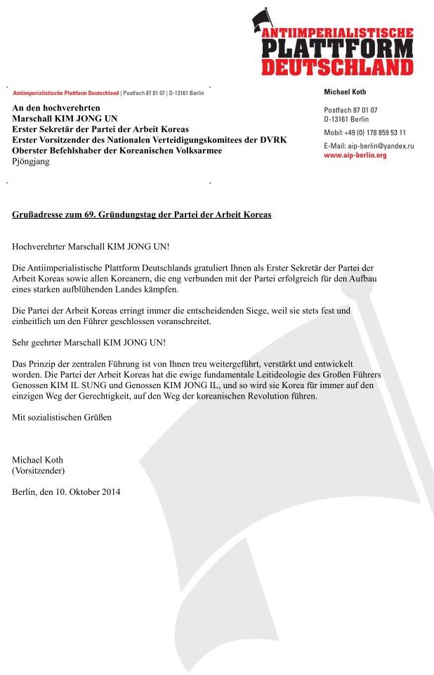 Die Antiimperialistische Plattform Deutschlands übermittelte aus Anlass des 17. Jahrestages der Wahl des Genossen Kim Jong Il zum Generalsekretär der Partei der Arbeit Koreas (PdAK) am 08.10. und anlässlich des 69. Gründungstages der PdAK am 10.10. dem Genossen Kim Jong Un durch die Botschaft der DVRK in Berlin zwei Grußbotschaften. Damit unterstreichen wir die engen Verbindungen zwischen der PdAK und der AiP und versichern unsere uneingeschränkte Solidarität mit dem koreanischen Volk für ein selbstbestimmtes Leben und die friedliche Wiedervereinigung des Vaterlandes ohne Einmischung äußerer feindlicher Kräfte. Hierbei nimmt die PdAK die führende Rolle ein.