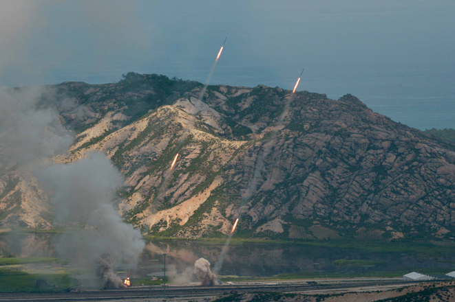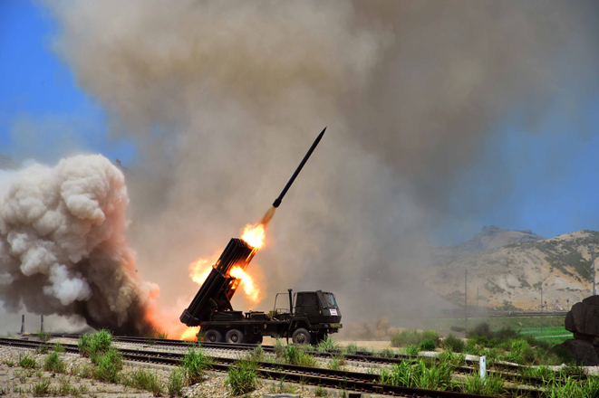 Die Armee und das Volk der DVRK, die mit den Fahnen mit den Sonnenporträts von Kim Il Sung und Kim Jong Il für den endgültigen Sieg vorwärts schreiten, haben heute den Marschall Kim Jong Un, einen weiteren eisernen Heerführer, an der Spitze der Revolution. In der gespannten Zeit, wo es um Krieg oder Frieden und um die Existenz als souveränes Volk oder als unterwürfige Sklaven ging, hob er das Banner für totale Konfrontation mit den USA hoch. Angesichts der tollkühnen Konfrontationsmachenschaften der Feinde, die DVRK unbedingt mit Waffengewalt zu unterwerfen, leitete er im Juli Juche 103 (2014) eine Übung zum Start von taktischen Raketen. Dabei betonte er, auch wenn man gütig und gerecht sei, würde man den Starken zum Opfer fallen und verliere auch die wertvolle Geschichte, die unter Blutopfern fortgesetzt worden sei, an Glanz, wenn man kraftlos sei. Daher solle man sich noch intensiver um die Vervollständigung der Kampfbereitschaft bemühen.