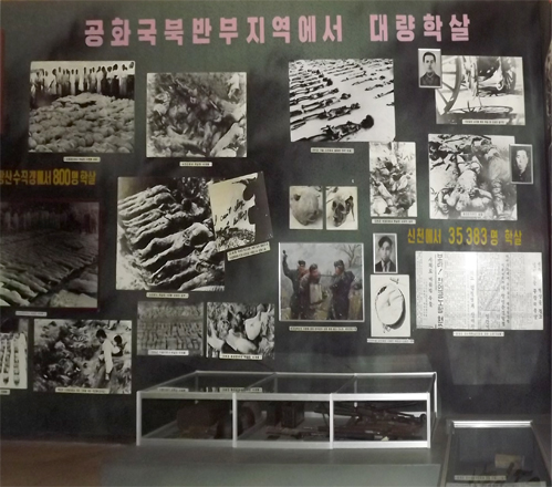 Dort waren die Fotos darüber zu sehen, dass die US-Aggressoren in der Zeit des strategischen zeitweiligen Rückzuges der Koreanischen Volksarmee überall im nördlichen Teil Koreas die Koreaner, Mann und Frau, alt und jung, gruppenweise verbrannt, lebendig begraben und grausam ermordetet hatten. Die Führerin erklärte, dass die Amerikaner in den zeitweilig besetzten Gebieten im nördlichen Teil Koreas die Koreaner auf die brutalsten Weisen ermordet hatten, die die menschliche Vorstellung weit übertreffen.