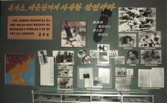 In der Ausstellung waren auch die Fotos über die Greueltaten der US-Imperialisten zur Schau gestellt, durch die Anwendung der bakteriologischen und der giftigen Chemiewaffen die Koreaner massakriert zu haben, was einen groben Verstoß gegen das anerkannte Völkerrecht bedeutet.
