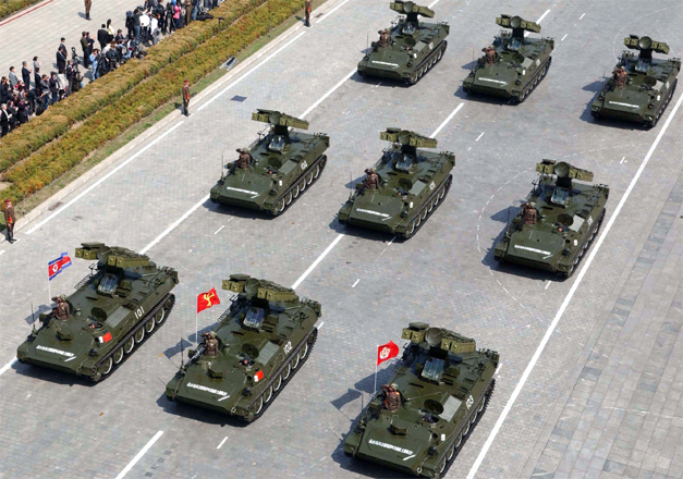 Die Armee und das Volk der DVRK werden mit den Waffen der Revolution, die vom hehren Leben des Präsidenten Kim Il Sung und des Genossen Kim Jong Il zeugen, unter der Führung der Songun-Revolution durch den Marschall