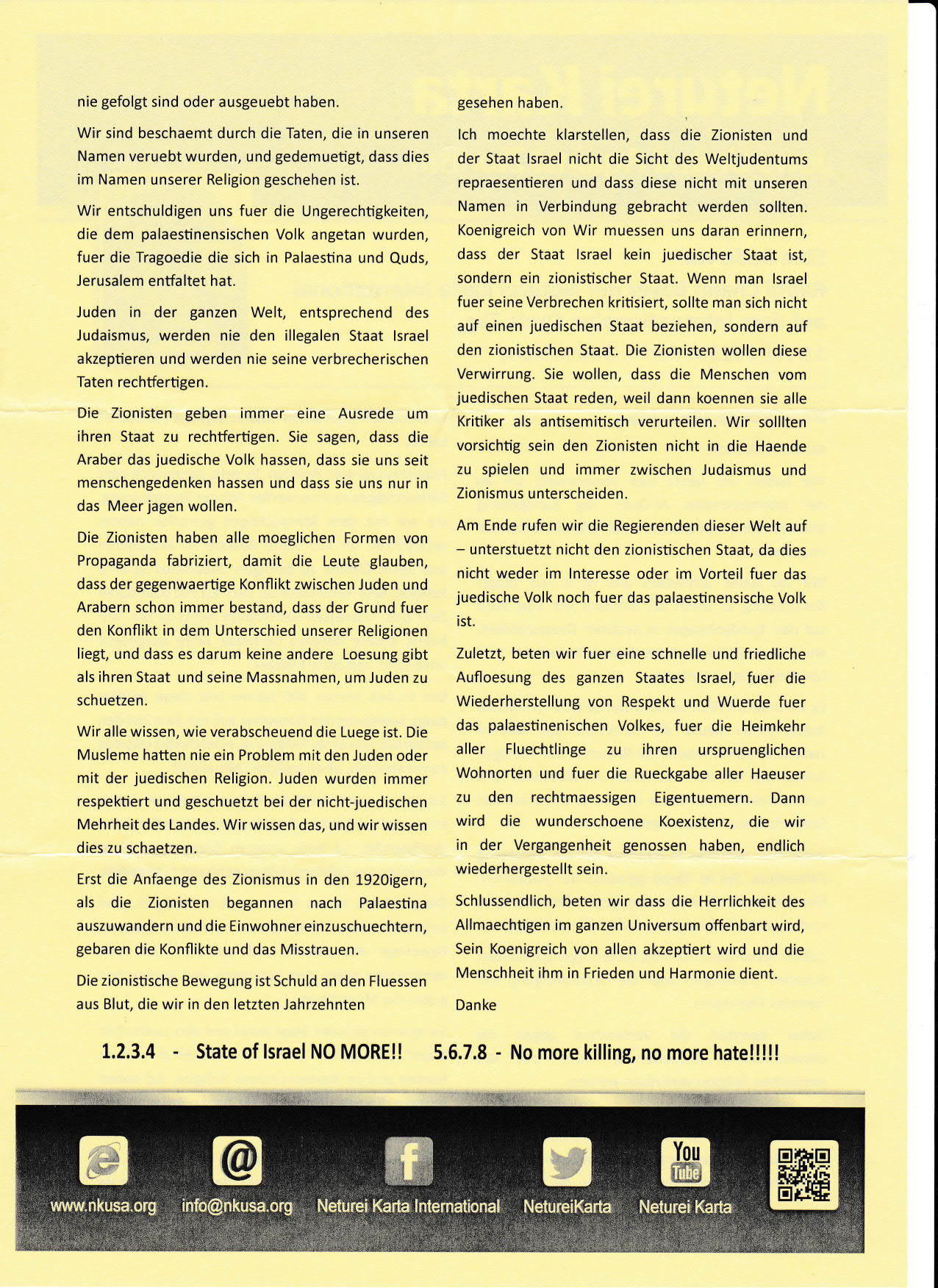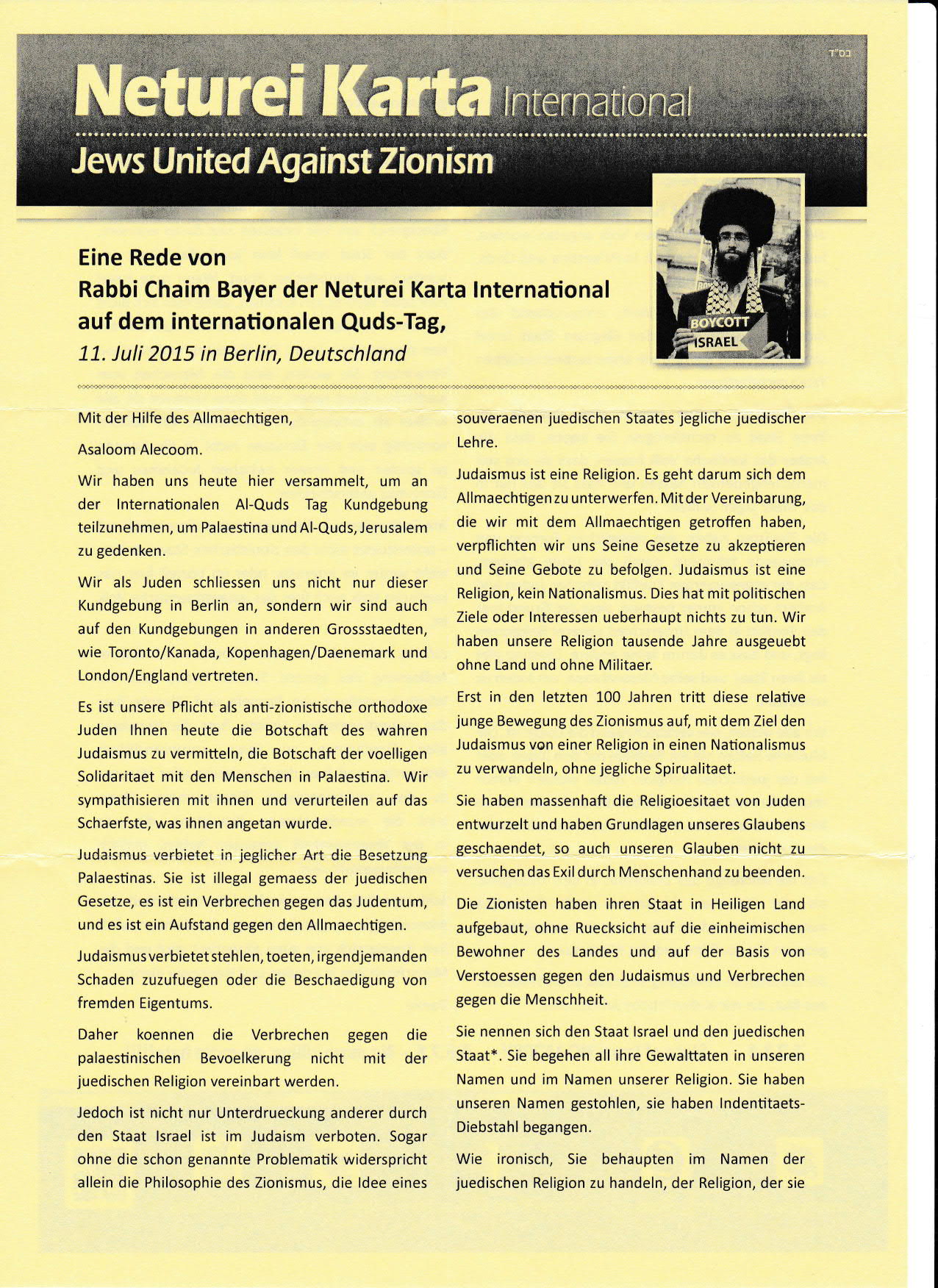 Die Teilnehmer versammelten sich am Adenauerplatz, um nach den Reden den Kurfürstendamm entlang zum Wittenbergplatz zu ziehen. Die Redner hoben hervor, dass es sich eben nicht um eine „antisemitische“ Demonstration handelt, wie es die teilweise zwangsfinanzierten Lügenmedien der BRD jedes Jahr gebetsmühlenhaft wiederholen. Denn dem Volk der Semiten gehören Juden wie Muslime in Palästina an. Die Aktionen richten sich ausschließlich gegen den Völkermord der zionistischen Regierung Israels, die weder die Semiten, noch die Juden oder das „Volk Israels“ repräsentiert, da sie hierzu nach der Aussage des Rabbis Chaim Bayer gar keine religiöse Legitimation hat. Hierzu gibt es eine nähere Ausführung im Text weiter unten.