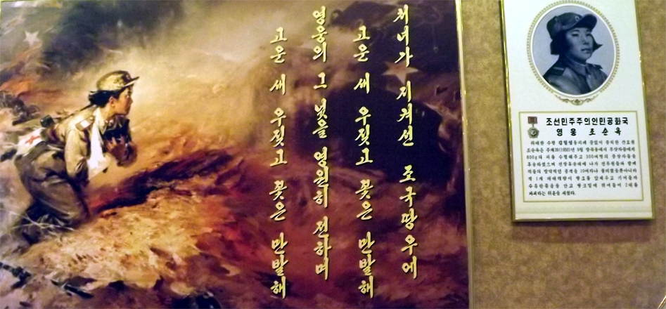 Hier sind die Ausstellungsgegenstände und Materialien über den Korea-Krieg gegen den militärischen Angriff der USA in den 1950er Jahren, wo das koreanische Volk unter Leitung vom großen Führer Genossen Kim Il Sung glänzenden Sieg errungen hatte. Wir traten mit anderen Besuchern in die Halle für die Helden der DVRK ein, in der die Materialien über die Kampfhelden ausgestellt waren. Diese Helden hatten für den Schutz des Vaterlandes ihr Leben geopfert.