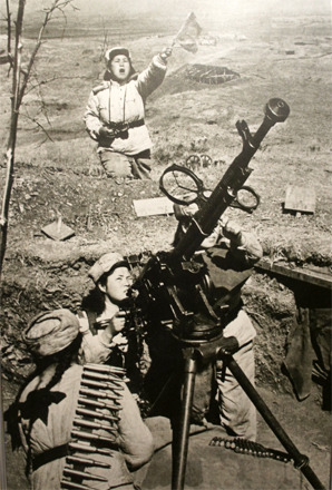 Viele Mitglieder der Flugabwehrgruppen vernichteten die feindlichen Flugzeuge, wobei sie großen Hass gegen die Feinde spürten. Allein in einem Jahr von Juche 40 (1951) wurden durch die Volksarmee 1754 feindliche Flugzeuge abgestürzt oder zerstört. Dank der hervorragenden militärischen Strategie und Weisheit des siegreichen und eisernen Feldherrn Kim Il Sung besiegten wir die USA, die sich die Weltstärksten nannten, und errangen großen Sieg im Krieg.“