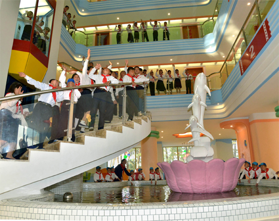 Für das Glück der Kinder und des Volkes bereist er ständig die ganze Republik, um das beste Kinderferienheim, das schönste Haus für Waisenkinder, das prächtige Altersheim, in dem die Alten den Rest ihres Lebens fröhlich verbringen können, und die Erholungsstätte für Wissenschaftler und das Arbeiterheim neu aufzubauen. Er sorgte dafür, dass die Bürger der DVRK im komplexen Schwimmbad, auf dem Schigelände und im Reitklub ein zivilisiertes Leben führen.