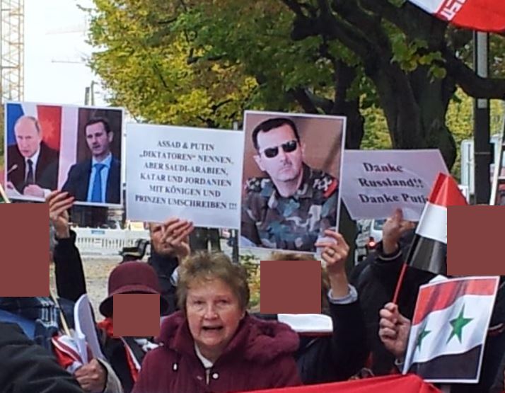 Besonders eindruckvoll gestaltete sich die Rede der Genossin Brigitte Queck („Mütter gegen den Krieg Berlin-Brandenburg“), die als wahre Internationalistin zur Aktionseinheit zwischen der deutschen Friedensbewegung und allen Antiimperialisten der Welt aufrief. In einer weiteren Rede durch den Leiter des pro-Assad Studentenverbandes in der BRD wurde die solidarische Unterstützung der legitimen Regierung Syriens unter Präsident Assad durch Russland, China, Venezuela, Bolivien, Kuba und weitere Staaten positiv hervorgehoben. Besonders dankte er auch den „bösen“ Nordkoreanern unter Führung des hochverehrten Marschalls Kim Jong Un, die zwei Schiffe mit Hilfgütern nach Aleppo entsandten, und deren Besatzung begeistert empfangen und gefeiert wurde.