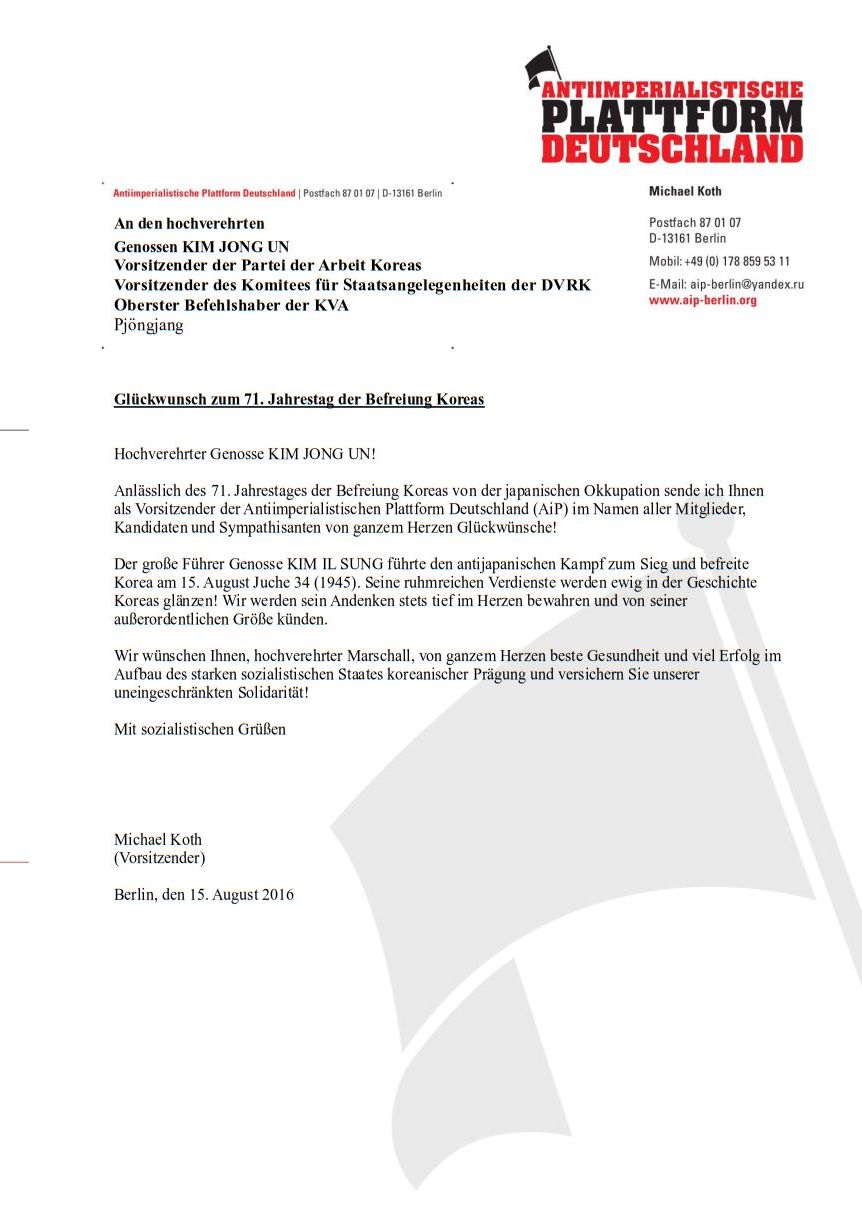 Auf vielfache Anfrage veröffentlichen wir die letzten Grußbotschaften an den verherten Genossen Kim Jong Un. Diese sind Dokumente der unverbrüchlichen Freundschaft zwischen der ruhmreichen Partei der Arbeit Koreas (PdAK) und der Antiimperialistischen Plattform Deutschland. Sie stellen Dokumente der Kontinuität unserer Organisation im Kampf um die Einheitsfront aller deutschen Patrioten gegen den Hauptfeind der Menschheit, den US-Imperialismus, seine Hintermänner und Vasallen, dar.