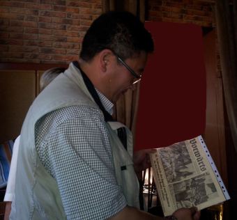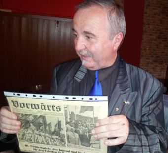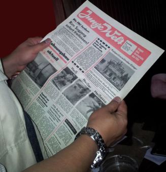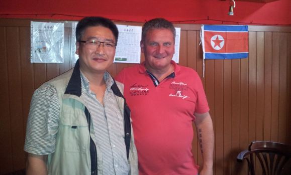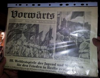 Schon in guter Tradition überreichten wir dem anwesenden Genossen von der Botschaft der DVR Korea in der BRD historische Ausgaben von DDR-Zeitungen. Darunter war das Organ des Zentralrats der FdJ Junge Welt, aber auch eine Rückschau in die Vergangenheit zu den III. Weltfestspielen der Jugend und Studenten 1951, die im demokratischen Sektor Berlins feierlich stattfanden und zu einem wahren Triumphzug der Delegation der DVR Korea, die sich ja damals im erbitterten Kampf gegen die US-Aggression befand, entwickelte. Dazu passend überreichte unser Vorsitzender die Originalausgabe des Neuen Deutschlands vom Tage nach der Eröffnung mit der Überschrift Koreas Jugend mit Blumen überschüttet… . Unser koreanischer Genosse informierte uns über die aktuelle Lage auf der Koreanischen Halbinsel und die bahnbrechenden neuen militärischen Forschungserfolge. Die mehrstündige Veranstaltung verlief in gewohnt kämpferischer Atmosphäre, und es kam zu einer spontanen Begegnung mit einem Gast des Objektes, der sich stolz als ehemaliger Angehöriger der Deutschen Volkspolizei vorstellte (… ick war doch früher lange ABV jewesen…). Er fragte nach unseren Zielen und unserem Namen und begriff sofort, dass wir anscheinend an die positiven Traditionen des Antiimperialistischen Solidaritätskomitees der DDR, damals unter Leitung des verdienten Genossen Kurt Seibt, versuchen anzuknüpfen. Genosse Bernd Brückner überbrachte uns telefonisch die besten Wünsche zum Ablauf der Veranstaltung, an der er aus dienstlichen Gründen nicht teilnehmen konnte.