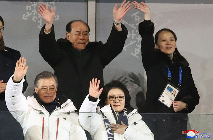 Kim Yong Nam, Kim Yo Jong, Präsident Moon Jae In und seine Ehefrau erhoben sich und begrüßten mit Handbewegungen die innerkoreanischen Sportler.