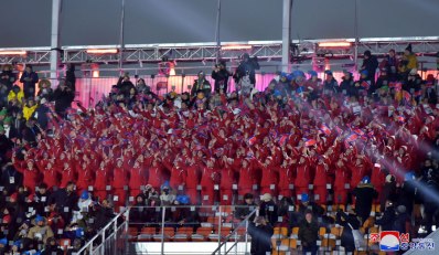 Auf der Tribüne des Eröffnungsfeierplatzes nahmen ihre Plätze ein: die DVRK-Delegationsleiter auf hoher Ebene Kim Yong Nam, Vorsitzender des Präsidiums der Obersten Volksversammlung der DVR Korea, und Kim Yo Jong, erste stellvertretende Abteilungsleiterin des ZK der PdAK.
