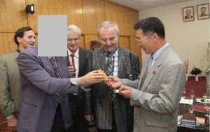 Die schöne Veranstaltung wurde durch eine programmatische Rede des Genossen Kim Hak (Botschaftsrat) eröffnet, in dem er darüber referierte, aus welchen Gründen der Sozialismus in Osteuropa und damit auch der DDR untergehen musste, in dem er sehr scharfsinnig die entsprechenenden historischen Zitate aus den unsterblichen Werken der großen Generalissimusse KIM IL SUNG und KIM JONG IL zur Anwendung brachte. Seine Ausführungen wurden mit herzlichem Beifall aufgenommen.