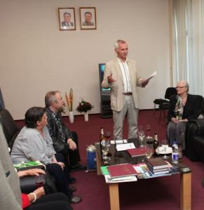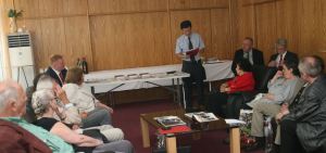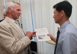 Dann ergriff Genosse Karl Diedrich das Wort und bedankte sich im Namen seiner neugegründeten Freundschaftsgruppe herzlich für die Einladung. Er schilderte aus eigenem Erleben fast 60 Jahre deutsch-koreanische Freundschaft. Er überreichte – wie Andere auch – mehrere Freundschaftgeschenke und betonte in eigener Sache, die unsere Sache ist: Er wird sich niemals mehr von den Sektierern und Dogmatikern in der sog. Linken vom progressiven Kampf zur Unterstützung des so erfolgreichen sozialistischen Koreas abhalten lassen!