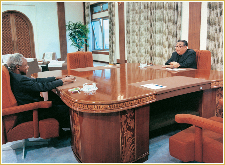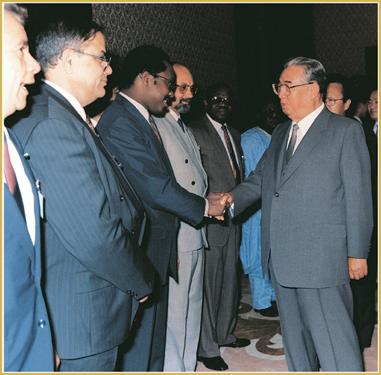 Er traf sich mit den Führern vieler Länder wie Mosambik, Simbabwe, Namibia und Uganda und gab ihnen wertvolle Hinweise, die man zum Kompass für das Erreichen der politischen Unabhängigkeit und des nationalen Gedeihens machen sollte, und half ihnen materiell und moralisch. Noch heute ist diese Geschichte überliefert. Deshalb wurden in Afrika die Worte „Wer die Revolution führen will, muss Genossen KIM IL SUNG kennenlernen.“ zu einer offiziellen Sprache des Kontinents.