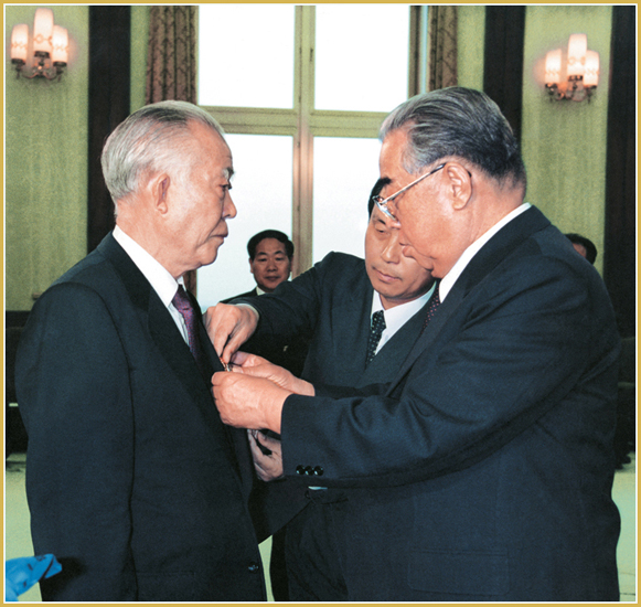 KIM IL SUNG wird von Hermann Schwiesau, Botschafter der DDR in der DVRK der Orden Karl Marx, höchster Orden Deutschlands, verliehen