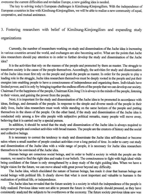 Am 14. und 15. September Juche 108 (2019) fand in Sofia, der Hauptstadt Bulgariens, die europäische Konferenz über die Juche-Ideologie statt. Daran nahmen Vertreter aus 9 Staaten Europas teil, darunter die Juche-Studiengruppen Berlin und Dresden. Auf der Konferenz wurden bedeutsame Reden gehalten und ein Schreiben an den hochverehrten