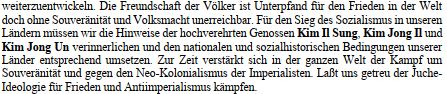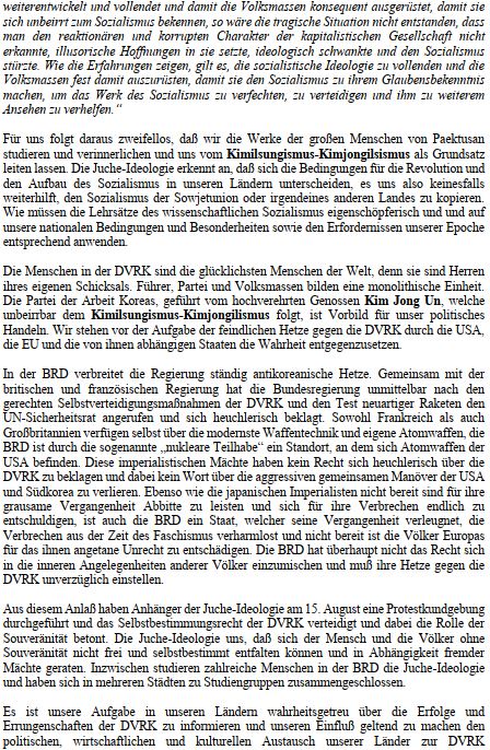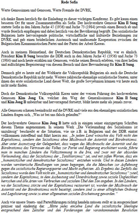 Aus aktuellem Anlass sein noch folgende Bemerkung gestattet. Vielen wird aufgefallen sein, dass wir auf Fotos und in Dokumenten wie in Zeiten der Illegalität Schwärzungen vorgenommen haben. Dies ist der Tatsache geschuldet, dass in der deutschen Arbeiter- und Volksbewegung auch weiterhin unerträgliche Zustände des Sektierertums und der Diskriminierung herrschen. Wir ersparen uns weitere Kommentare und verweisen nur auf das Zitat des Großen Führers Genossen KIM IL SUNG, das unser Vorsitzender Genosse Michael Koth in seiner Rede anführte…