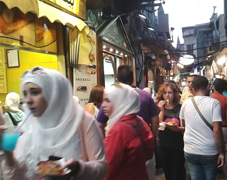Was mich in Damaskus am meisten beeindruckt hat, Sehenswürdigkeiten beiseite, ist die wunderbare und stimmungsvolle Atmosphäre in den Straßen. Vor allem abends sind die Straßen randvoll mit Menschen, alle Geschäfte sind offen, Bazars und Cafés, Restaurants… Lauter junge Leute überall – und übrigens sehr schöne Frauen, viele ohne Kopftuch.