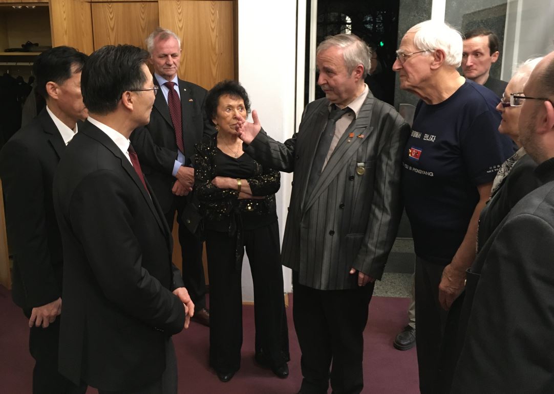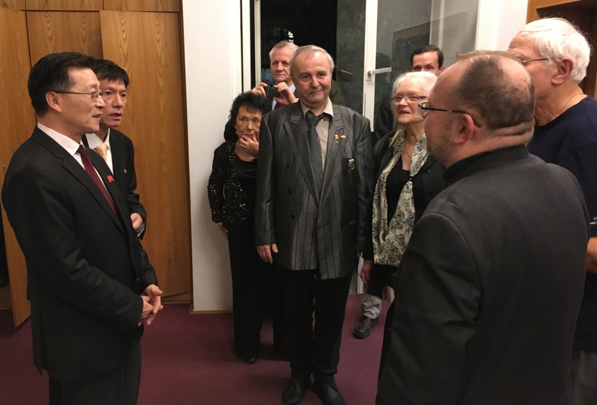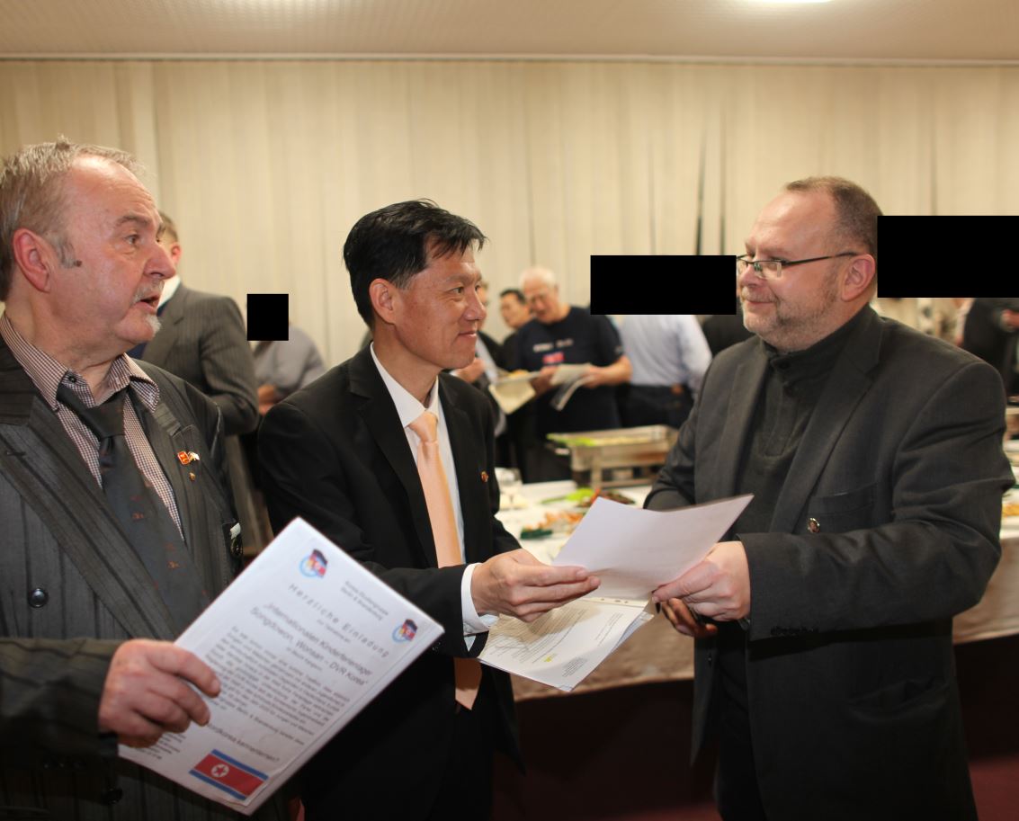 Schon traditionell war die Antiimperialistische Plattform Deutschland (AiP-D) und die mit ihr revolutionär-freundschaftlich verbundenen Organisationen der Juche-Studiengruppen und der Korea-Studiengruppe herzlich eingeladen und mit zahlreichen Mitgliedern, Kandidaten und Sympathisanten vertreten. Neben Bürgern aller Klassen und Schichten freuten wir uns besonders, die Delegation der KPD unter Leitung des Vorsitzenden Genossen Torsten Schöwitz zu begrüßen. Im Gegensatz zu vielen Wiederholungssendungen im BRD-Fernsehen, die viele Menschen nerven, wiederholten wir eine allerdings sehr schöne Tradition, in dem unser Genosse Vorsitzender, Michael Koth, S. E. dem Außerordentlichen und Bevollmächtigten Botschafter der DVR Korea in der BRD, Genosse Pak Nam Yong, eine Originalausgabe des Neuen Deutschland (ND) vom 3. August 1951 überreichte (Ausgabe während der III. Weltfestspiele der Jugend und Studenten, in der die verbrecherischen Pläne der US-Imperialisten zur Ermordung des Großen Führers