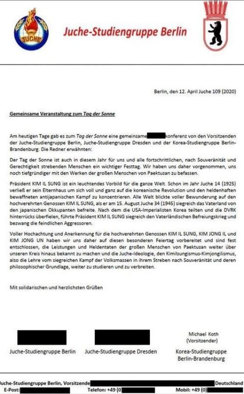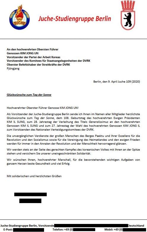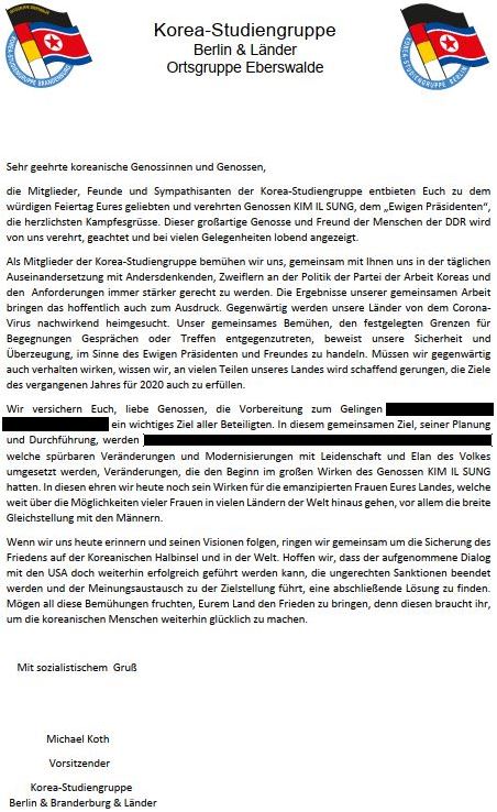 Ewigen Präsidenten KIM IL SUNG, überreichten wir der Botschaft der DVR Korea in der BRD die folgenden Grußbotschaften: