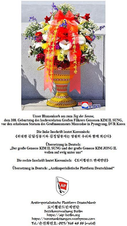 Im Folgenden stellen wir Ihnen die Würdigungen der Antiimperialistischen Plattform Deutschland (AiP-D) in der Presse der DVR Korea vor. Wir sind für diese Würdigungen unendlich dankbar, weil sie uns in unserer oft schwierigen Tätigkeit anspornen und beflügeln. Sie geben uns Mut für den Kampf um ein neutrales und paktfreies Deutschland und für die Souveränität unseres Heimatlandes.