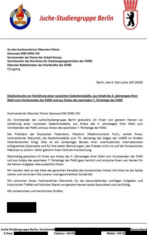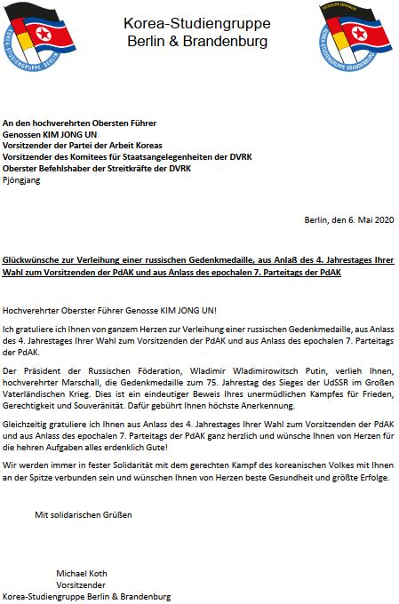 Aus Anlass der historischen Verleihung der Gedenkmedaille zum 75. Jahrestag des Sieges der UdSSR im Großen Vaterländischen Krieg an den hochverehrten Obersten Führer Marschall KIM JONG UN, Vorsitzender der Partei der Arbeit Koreas, Vorsitzender des Komitees für Staatsangelegenheiten und Oberster Befehlshaber der Streitkräfte der Demokratischen Volksrepublik Korea durch den Präsidenten der Russischen Föderation, Wladimir Wladimirowitsch Putin gratulierten wir dem geliebten Marschall KIM JONG UN auf das Herzlichste. Dieses bedeutsame Ereignis zeigt die Kontinuität von vielen Jahrzehnten der Freundschaft zwischen dem koreanischen und den Völkern Russlands. Die Freundschaft zwischen dem Großen Führer Genossen KIM IL SUNG und Generalissimus J. W. Stalin wie aber auch die Freundschaft zwischen dem geliebten Führer Genossen KIM JONG IL und den hervorragenden Vertretern der Sowjetführung wie Juri Andropow, Konstantin Chernenko und Gospodin-Towarischtsch Putin zeigen die Kontinuität und Flexibilität der Beziehungen zwischen zwei nicht-kapitalistischen fortschrittlichen Staaten. In der Gegenwart führt der geniale Genosse KIM JONG UN dieses Werk in die lichte Zukunft der Menschheit und zum endgültigen Niedergang des Imperialismus und Kapitalismus.