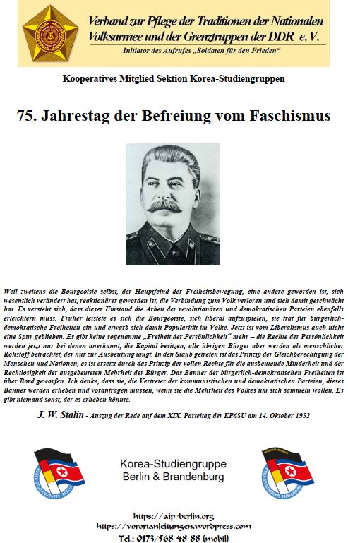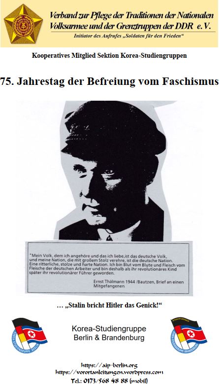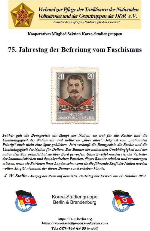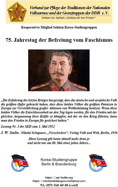 Dieser Eintrag wurde veröffentlicht am Samstag, 9. Mai 2020 um 14:28 und getaggt mit 2. Weltkrieg, 75. Jahrestag, B, Berlin, Brandenburg, DDR, Ernst, Faschismus, Hitler, Korea, KPdSU, Krieg, Lenin, Losungen, Nationalsozialismus, Nationalsozialisten, NS, NVA, Offensive, Plakate, Propaganda, Regime, SED, Sowjetunion, Stalin, Studiengruppe, Tag der Befreiung, Thälmann und veröffentlicht in Agitprop, Analyse, Asien, Europa, Geopolitik, Gesellschaft, Historische Dokumente, Imperialismus, Meldungen, Nachrichten, Russland. Du kannst den Antworten zu diesem Eintrag per RSS 2.0-Feed folgen.