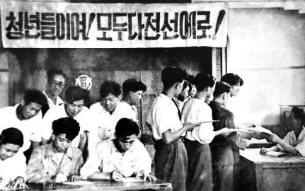 der KIM-IL-SUNG-Universität an der Spitze meldeten sich zahlreiche werktätige Jugendliche aller Fabriken, Bergwerken, Betrieben und Dörfer im nördlichen Landesteil der Republik freiwillig zum Kriegsdienst an der Front…