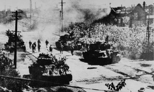 Motorisierte Truppen der KVA rücken in die Stadt Taejon ein.