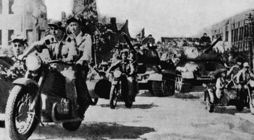Die Kämpfer der Volksarmee marschieren mit einer Panzertruppe in die Stadt Seoul ein.