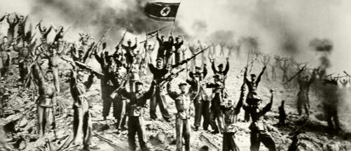 Die Volksarmisten stürmen vorwärts, die Feinde vernichtend.