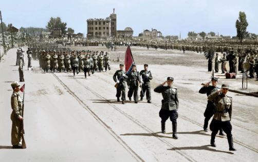 Paradekolonnen der heroischen KVA defilieren voller Würde auf dem Platz des Sieges im Krieg vorbei.