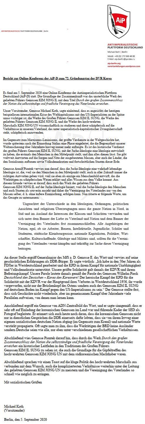Online-Konferenz der AiP-D zum 72. Gründungstag der DVR Korea
