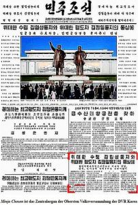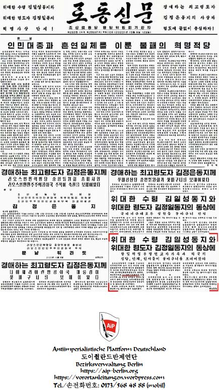 Zum 75. Gründungstag der Partei der Arbeit Koreas widmete die Antiimperialistische Plattform Deutschland (AiP-D) einen Blumenkorb für die Statuen der großen Führer Genossen KIM IL SUNG und KIM JONG IL. Hierüber berichtete heute die Parteizeitung Rodong Sinmun in Koreanisch, Englisch und Chinesisch.