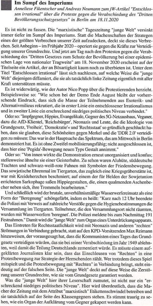 In den letzten Monaten schwenkte leider die jW voll auf den Hetzkurs gegen sog. Verschwörungstheoretiker, Corona-Leugner, Hippies, Langhaarige und Dumme ein. Während man sonst keine Probleme mit Menschen mit längeren Haaren hatte, wird dies jetzt mit als Ausschlussgrund gewertet, die nicht in die sog. „Volksgemeinschaft“ der BRD passen. Die Krankheitssymptome begannen sich aber schon vor ca. 10 Jahren zu zeigen. Der legendäre Kundschafter des Friedens Rainer Rupp wurde auf eine makabre und perverse Art aus der Reaktion der jW geekelt, weil er angeblich seine Artikel vorher gefälligst korrekturzulesen hätte.