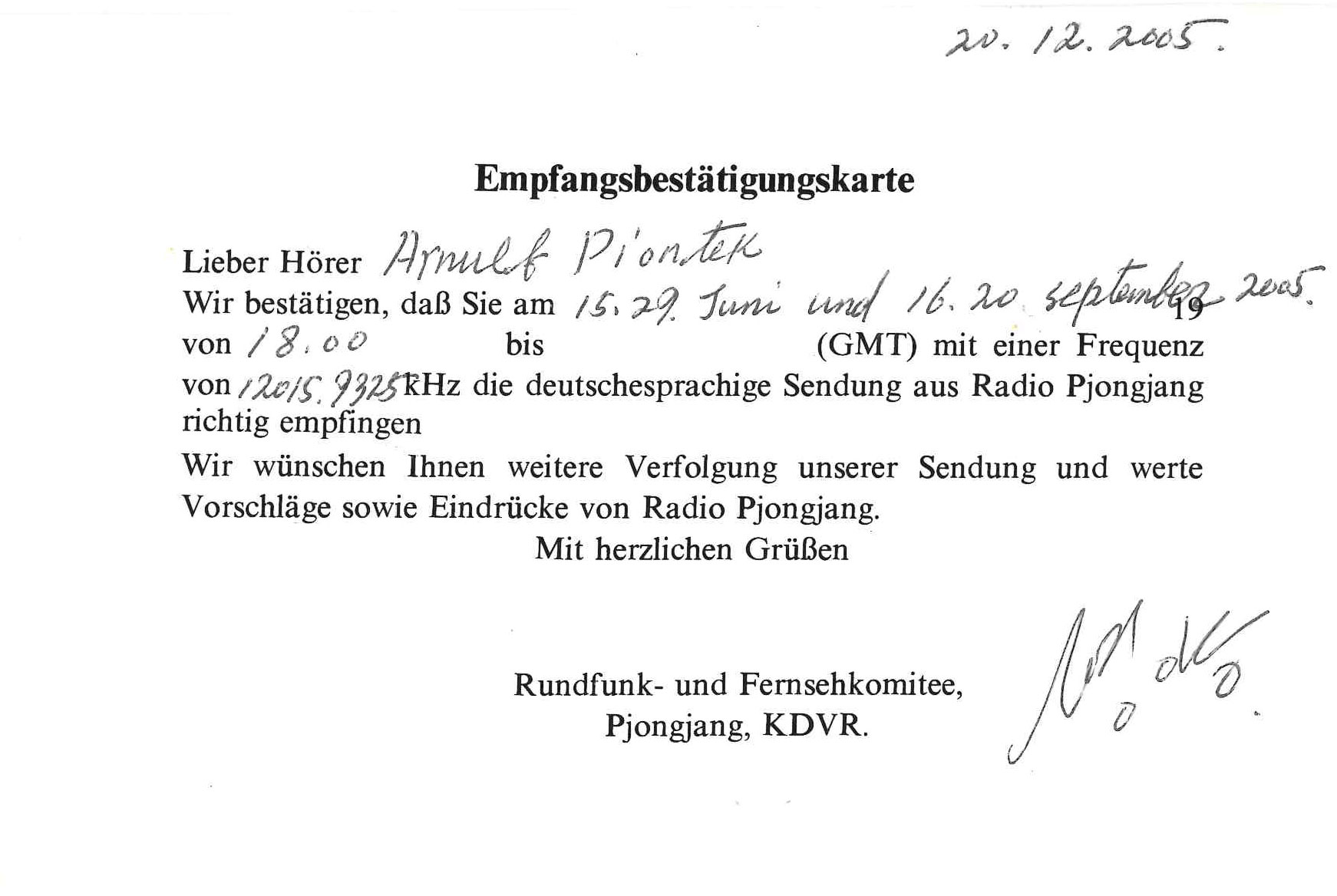 Wie in allem, war unser Genosse Arnulf auch in seiner Kurzwellen-Leidenschaft außerordentlich gewissenhaft und immer bemüht, die bestehenden Beziehungen zu intensivieren. Dabei geizte er nie an guten Vorschlägen und ging dafür auch ungewöhnliche Wege, wie folgendes Schreiben aus dem Jahr 2005 an den Geliebten Führer KIM JONG IL eindrucksvoll beweist.