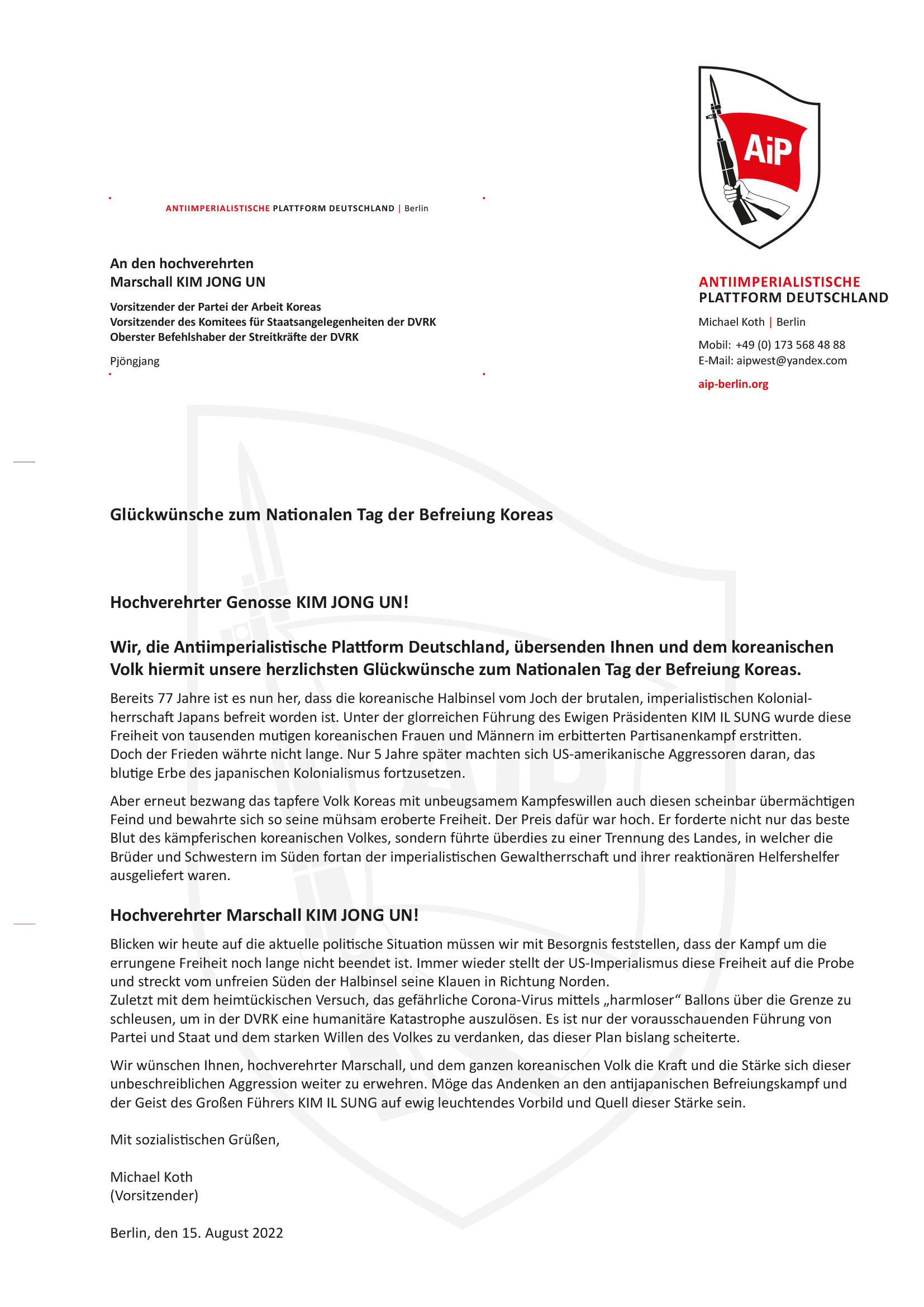 Grußbotschaft zum Nationalen Tag der Befreiung Koreas