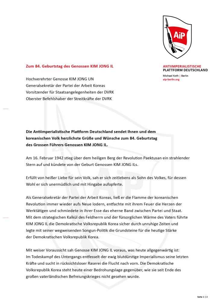 Die Antiimperialistische Plattform Deutschland sendet Ihnen und dem koreanischen Volk herzlichste Grüße und Wünsche zum 84. Geburtstag des Grossen Führers Genossen KIM JONG IL.