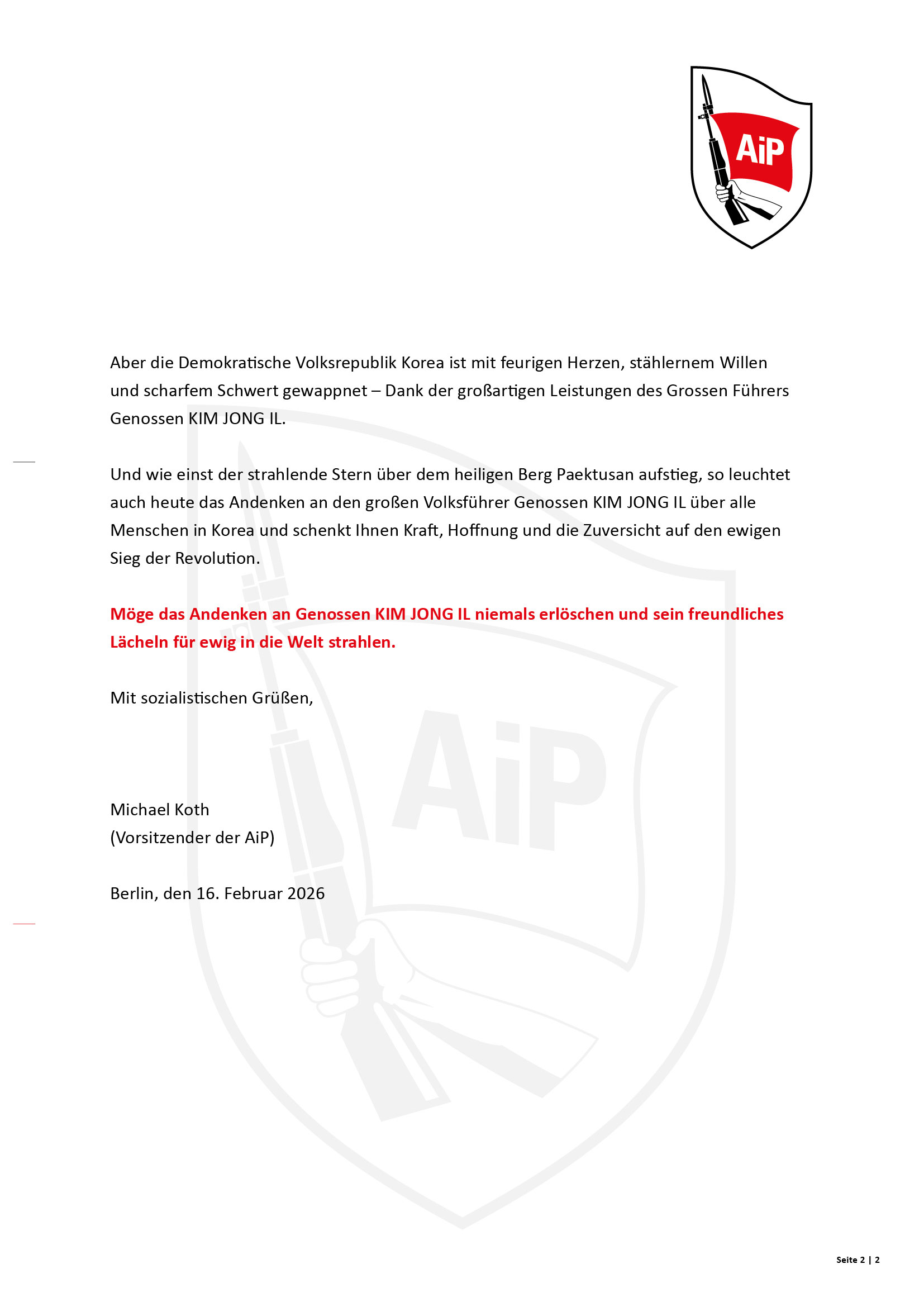 Die Antiimperialistische Plattform Deutschland sendet Ihnen und dem koreanischen Volk herzlichste Grüße und Wünsche zum 84. Geburtstag des Grossen Führers Genossen KIM JONG IL.