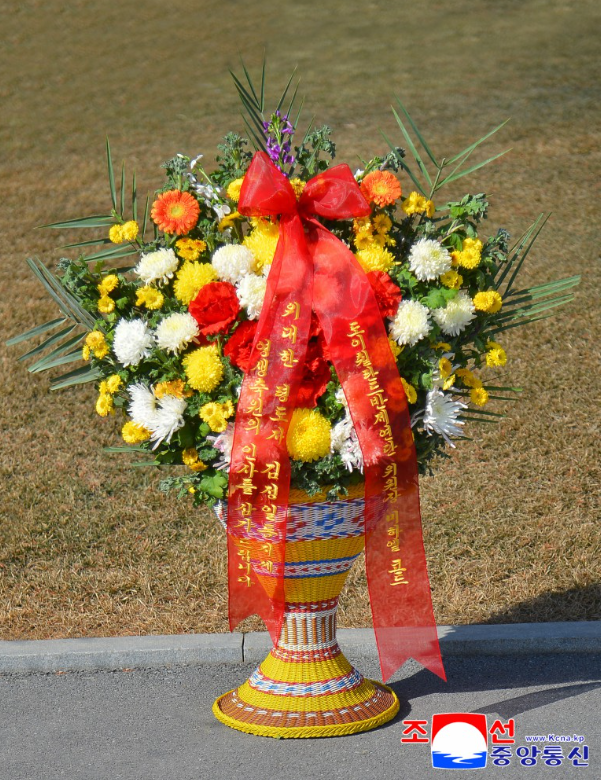 Dem koreanischen Volk zur Freude und dem großen Staatsmann zur Ehre und zum Andenken, ist der Blumenkorb Symbol für das brüderliche Band, das uns seit vielen Jahren verbindet, und Ausdruck unserer innigen Freundschaft mit der Demokratischen Volksrepublik Korea.