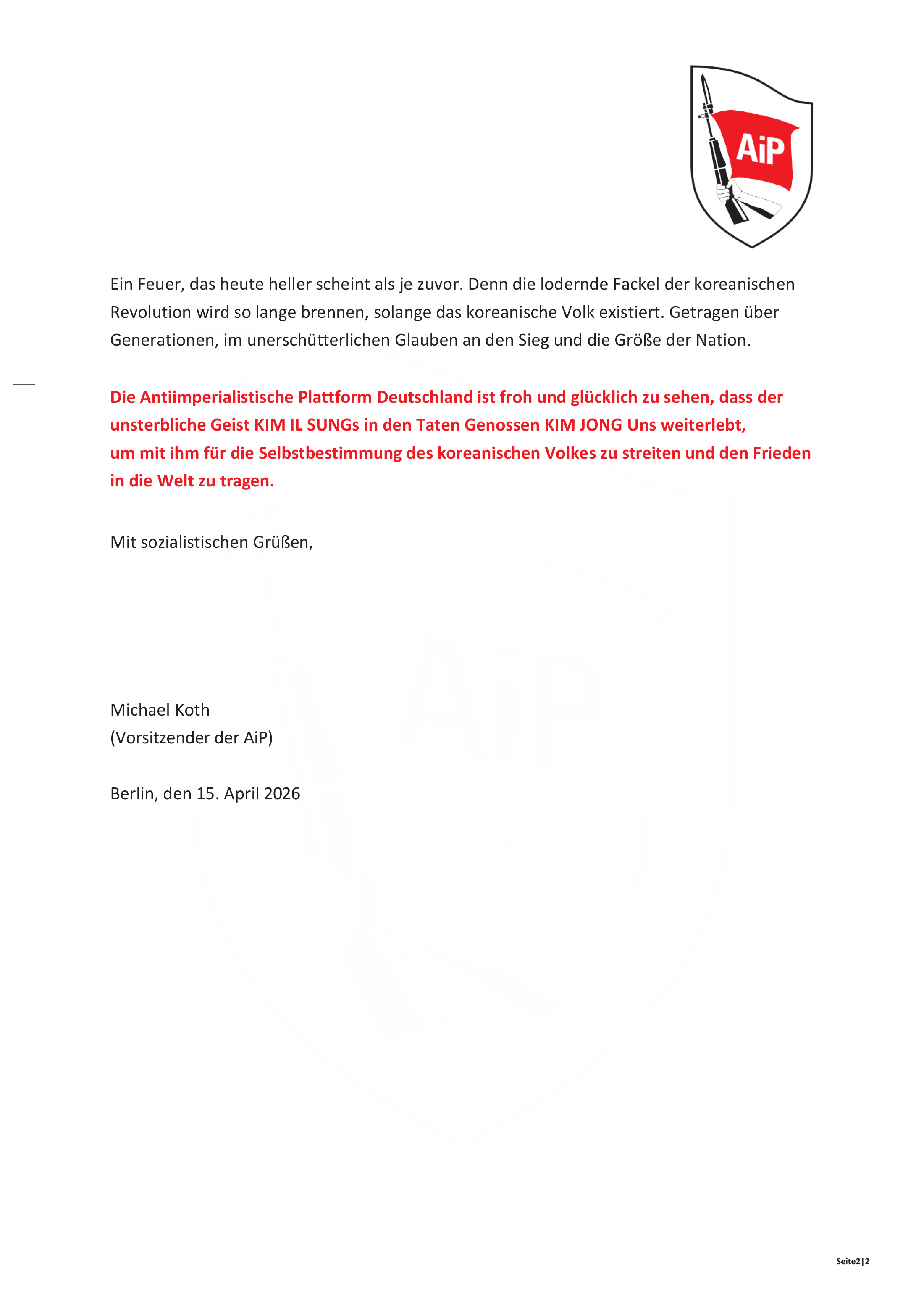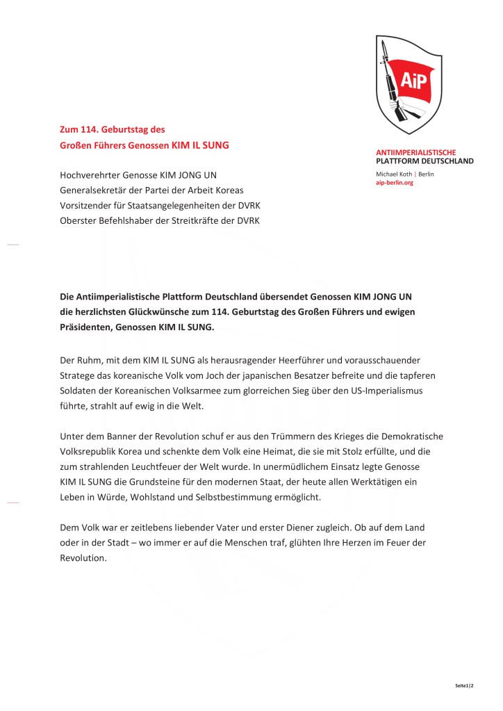Zum 114. Geburtstag des Großen Führers und ewigen Präsidenten, Genossen KIM IL SUNG, überreichte die Antiimperialistische Plattform Deutschland eine Grußbotschaft an seine Exzellenz, den Botschafter der Demokratischen Volksrepublik Korea in der BRD.