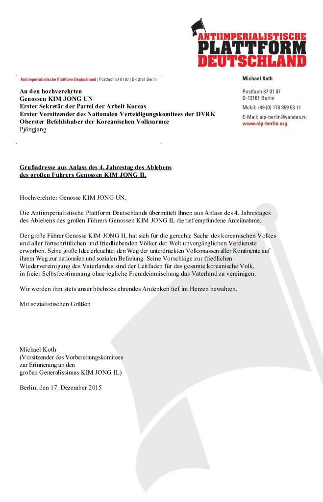 Kim Jong Il besuchte eine Delegation der Antiimperialistischen Plattform Deutschland unter Leitung ihres Vorsitzenden Genossen Michael Koth und unter Teilnahme des Chefredakteurs der Zeitung Die Wahrheit die Botschaft der DVR Korea in der BRD und überreichte feierlich einen Blumenstrauß zum Gedenken sowie eine Grußbotschaft an den Genossen Kim Jong Un (s.u.). Die anschließenden Gespräche verliefen wie gewohnt in herzlicher, aufrichtiger und würdevoller Atmosphäre. In allen behandelten Fragen wurde völlige Übereinstimmung erzielt.