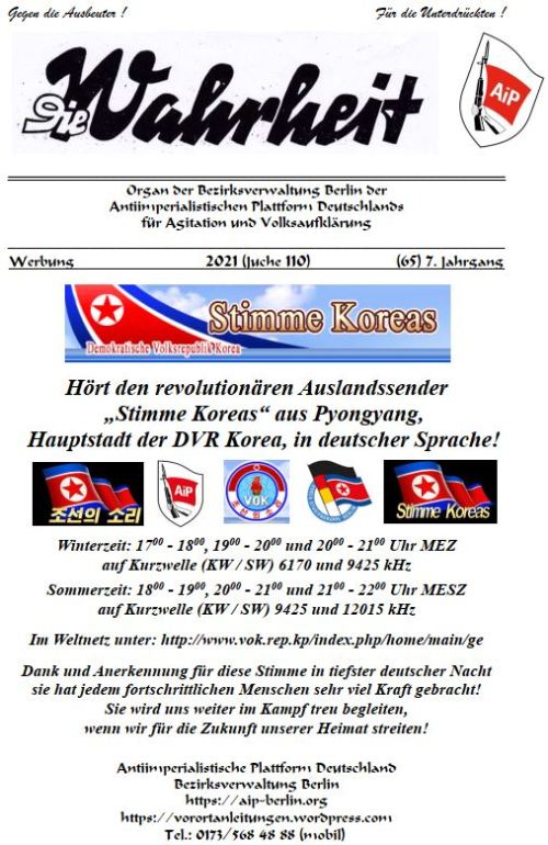 Hinterlasse einen Kommentar | Schlagwörter: AiP, AiP-D, Antiimperialistische Plattform, Antiimperialistische Plattform Deutschland, Antiimperialistische Plattform Deutschlands, Armee, Ausdruck, Broschüre, Demokratische Volksrepublik Korea, download, drucken, DVR Korea, DVRK, Führer, Generalissimus, Generalissimusse, Genosse, Genossen, großer Führer, Heft, herunterladen, Homepage, Imperialismus, Juche, Juche-Ideologie, Kampf, KDVR, Kim Il Sung, Kim Jong Il, Korea, Koreanisch, Koreanische Demokratische Volksrepublik, Koreanische Volksarmee, Krieg, KVA, Nation, Netzseite, Nord-Korea, Nordkorea, Partei, Partei der Arbeit Koreas, PdAK, Pjöngjang, Prägung, Publikation, Pyongyang, Revolution, Südkorea, Sendungen, Souveränität, Sozialismus, Stimme Koreas, Unabhängigkeit, US-Imperialismus, USA, Vaterland, Veröffentlichung, Volk, Volksmassen, Werbung, Werk | Veröffentlicht inAgitprop, Analyse, Asien, Geopolitik, Gesellschaft, Historische Dokumente, Imperialismus, Korea, Meldungen, Nachrichten