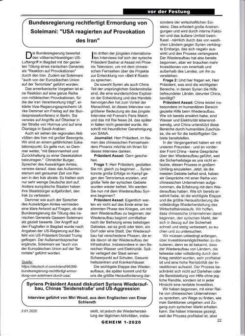 In dem Magazin GEHEIM erschienen in Ausgabe 1/2020 ein sehr interessantes Exklusivinterview mit Baschar al-Assad, das wir mit freundlicher Genehmigung des Verlags hier veröffentlichen.