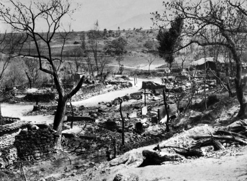 Ein durch Bombenabwürfe zerstörtes Dorf