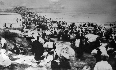 Einwohner verlassen wegen der Bedrohung der USA mit Atombomben ihre Heimat.