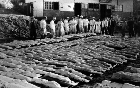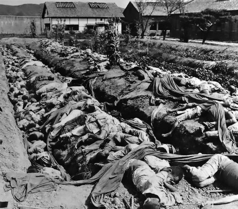 Ein Teil der Ermordeten im Luftschutzraum des Kreisparteikomitees Sinchon Vom 17. Oktober bis zum 7. Dezember 1950, also 52 Tage lang hielt eine US-Truppe den Kreis Sinchon besetzt und ermordete etwa 35 380 Menschen, die einem Viertel der Einwohnerzahl des Kreises entsprechen.