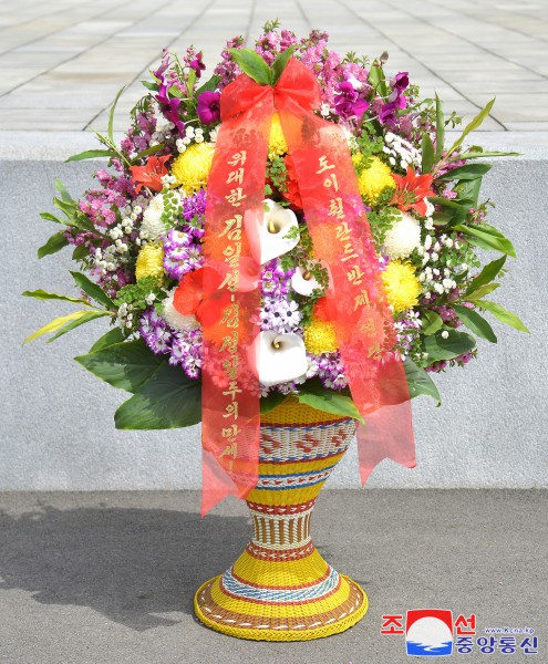 Der Blumenkorb wurde am 15. April in feierlicher Zeremonie vor den Monumenten des Großen Führers KIM IL SUNG und des geliebten Führers KIM JONG IL auf dem Mansudae-Hügel in Pjöngjang platziert.