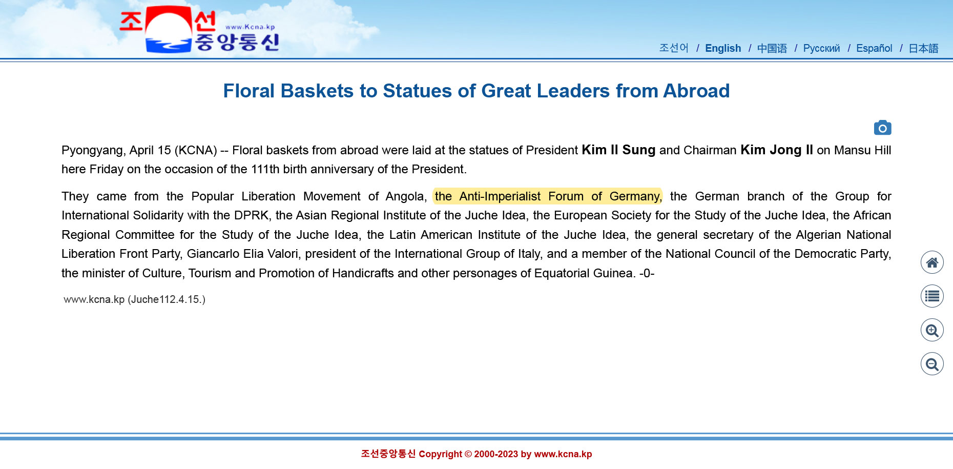 Darunter befinden sich unter anderem unsere Genossen der deutschen Abteilung des internationalen Solidaritätskomitees für die DPRK, die Volksbefreiungsbewegung von Angola, die Institute für Juche-Studien Asiens und Lateinamerikas, die europäische und die afrikanische Juche-Studiengesellschaft, der Kultusminister Äquatorial-Guineas und viele weitere mehr.