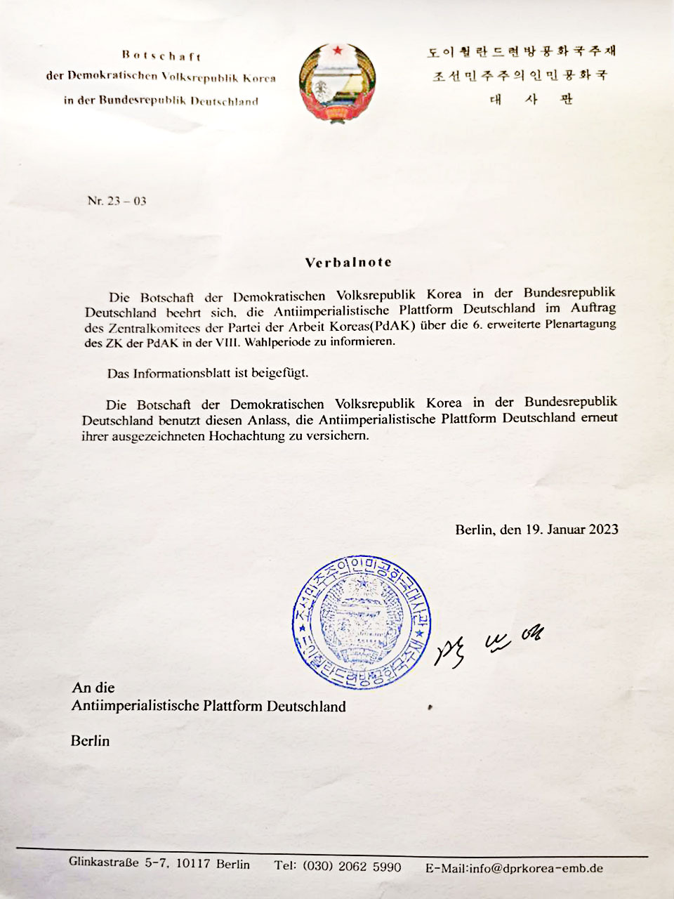 In diesem Zuge überreichte die Botschaft eine Verbalnote, die ihrerseits das Band der Treue zwischen dem Volk der DVRK und den fortschrittlichen Kräften in Deutschland bekräftigte.