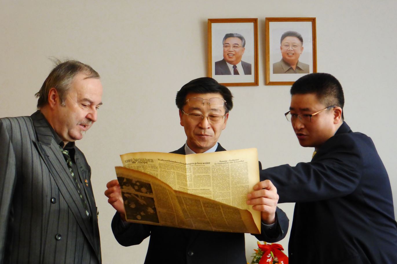Unser Genosse Vorsitzender überreichte abermals Originalausgaben von DDR-Zeitungen (zwei Mecklenburgische Landeszeitungen vom Juli 1951), in denen u. a. berichtet wurde, wie die US-Gangster unter Mithilfe eines Packs von Landesverrätern versuchten, am 38. Breitengrad in Phanmunjom den Großen Führer Genossen Kim Il Sung zu ermorden. Wir danken den koreanischen Genossen für die uns bisher unbekannten Informationen, dass der Große Führer Genossse Kim Il Sung während des gesamten Vaterländischen Befreiungskrieges (Korea-Krieg) teilweise von Spitzeln und Agenten umgegeben war, und die Angehörigen seines Personenschutzes sich zu Hunderten opferten, um ihn vor den Hochverrätern zu retten.